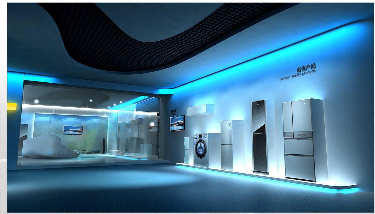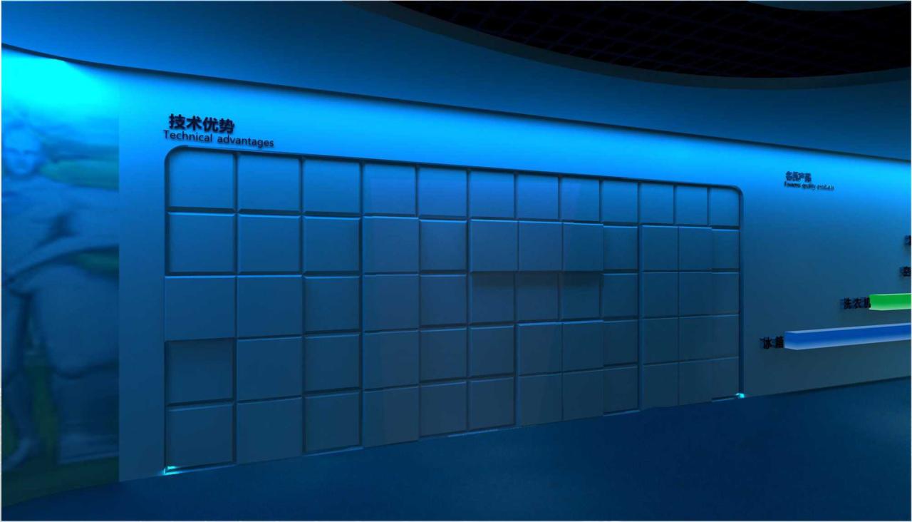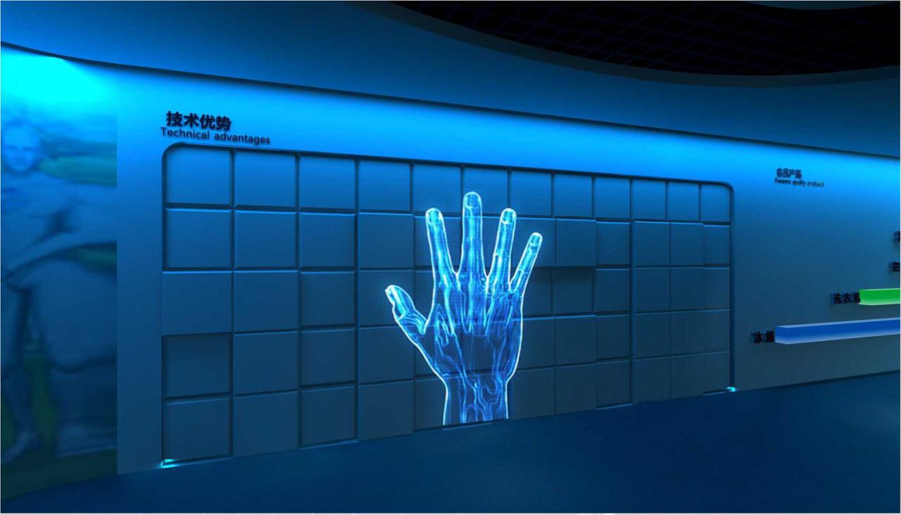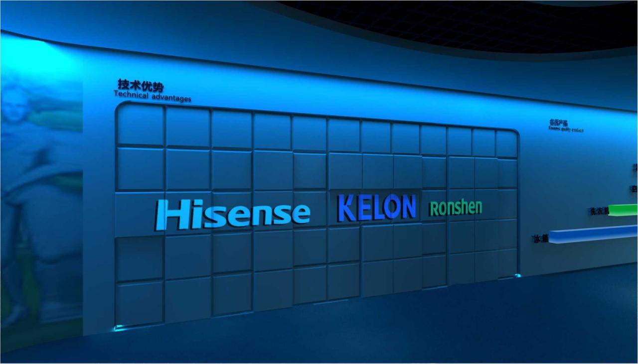 此次打造的多媒體展廳主要是為了展現(xiàn)海信科龍的歷程、產(chǎn)品、社會責(zé)任等,其運(yùn)用的呈現(xiàn)手段包括燈箱、噴繪、投影、觸摸屏、立體字等,在設(shè)計上以白色為基調(diào),藍(lán)調(diào)為點(diǎn)綴,色調(diào)高端大氣,且非常符合其產(chǎn)品常用色。