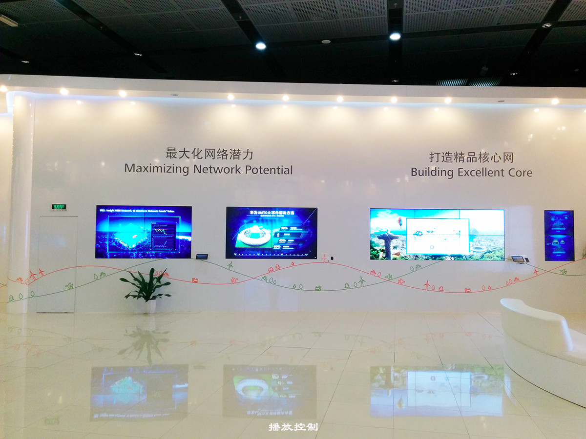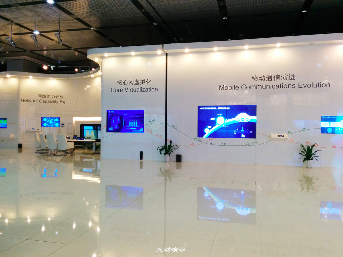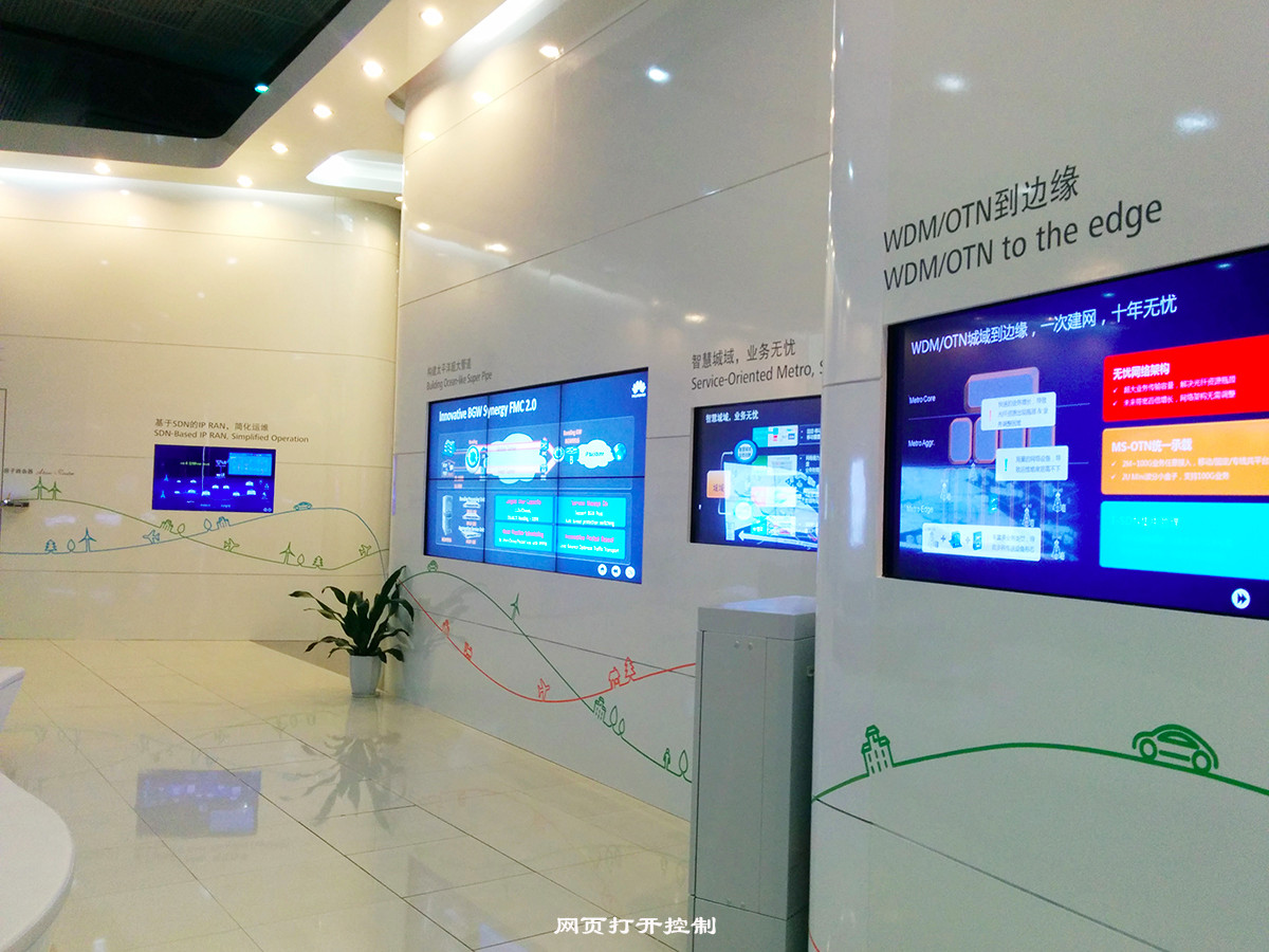 此次打造的展廳以展示華為的科技產(chǎn)品和技術(shù)手段為主,以傳統(tǒng)簡裝為基調(diào),白色為主色調(diào),藍(lán)色點(diǎn)綴。所有展示內(nèi)容包括產(chǎn)品影片、華為平臺(tái)、產(chǎn)品程序、解決方案程序、動(dòng)態(tài)海報(bào)等都是通過大屏或觸控大屏呈現(xiàn)。以最直觀最直接的方式將華為的展示意圖表現(xiàn)的淋漓盡致。