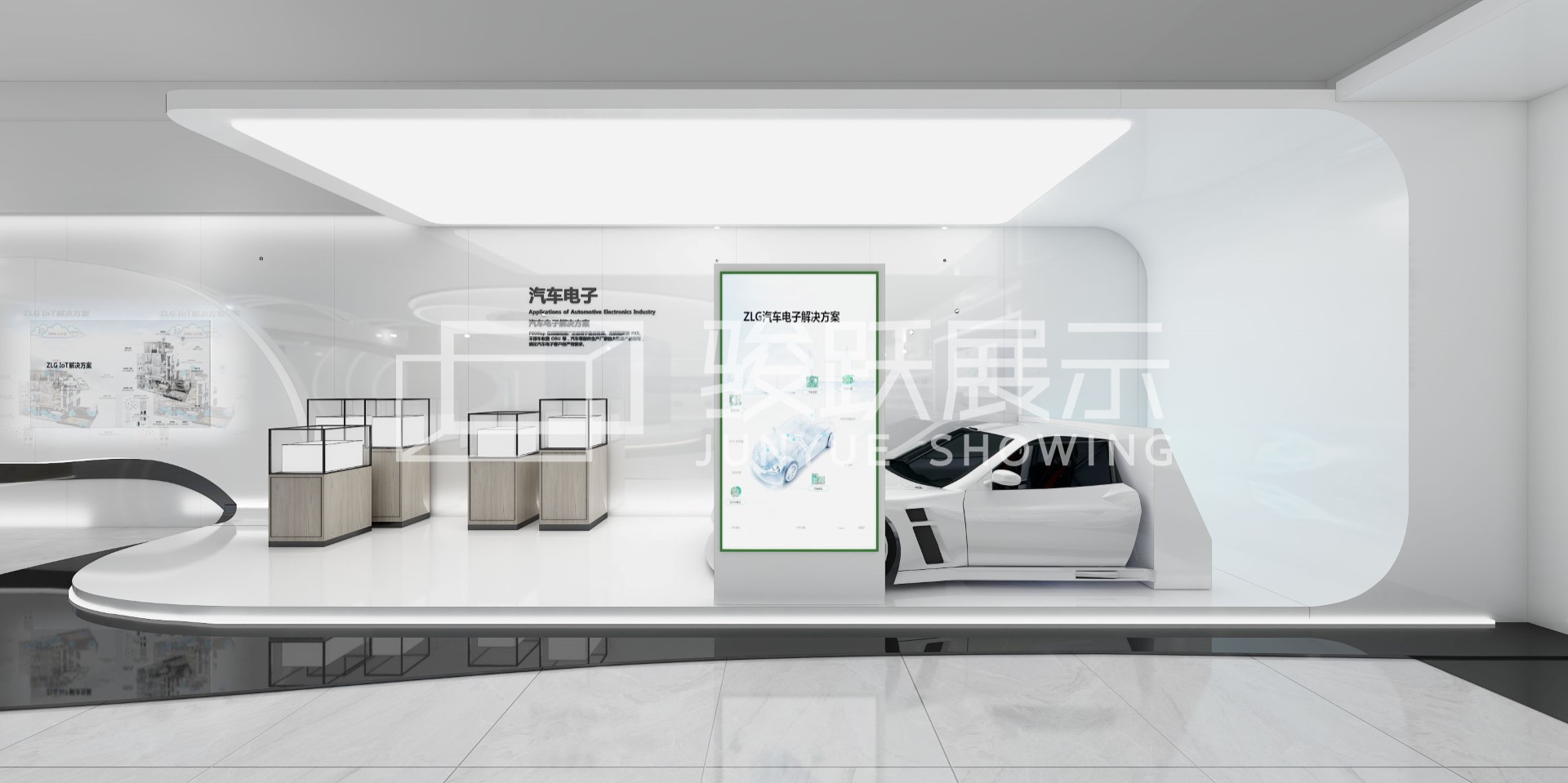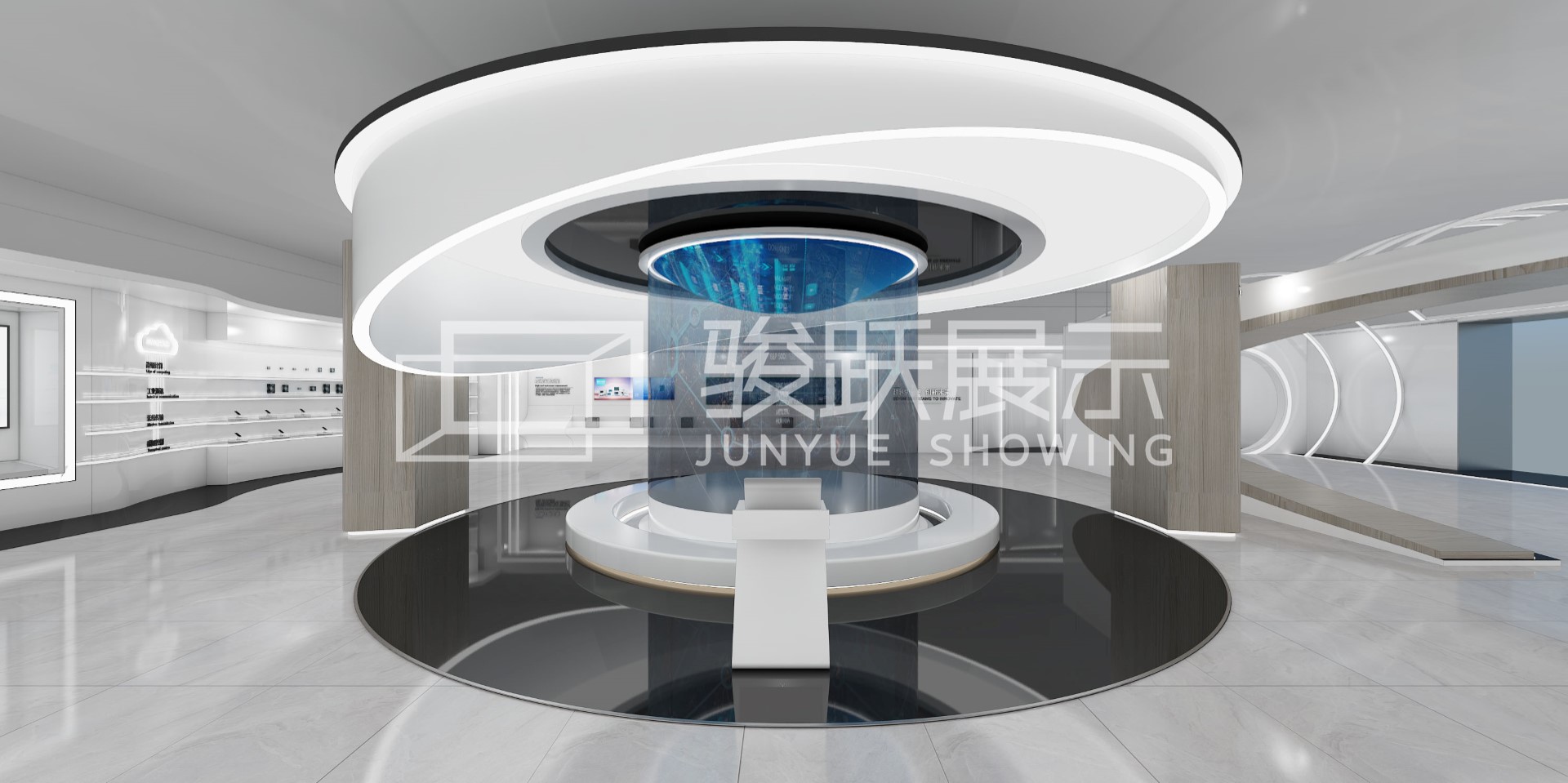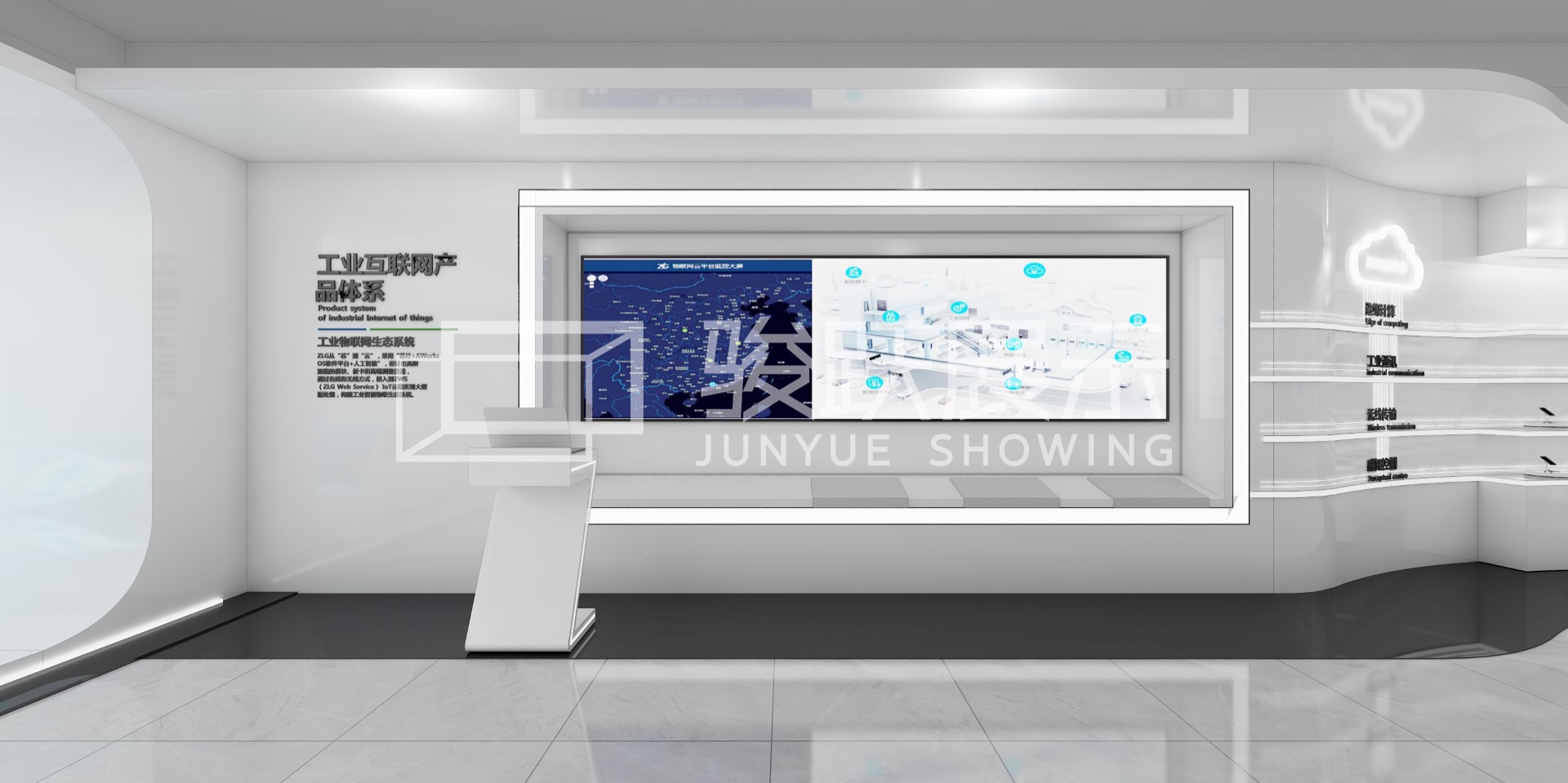 立功集團成立于1999年,致力與為工業(yè)、汽車電子用戶提供芯片和智能物聯(lián)解決方案。作為一家高科技研發(fā)公司,面對上下游近400家合作伙伴,展廳的必要性不言而喻。為了盡可能讓行業(yè)客戶快速認同立功品牌的實力,駿躍展示選用了360度玻璃全息的展示手段,立體化呈現(xiàn)出了立功的業(yè)務流場景,極具沖擊力的視覺體驗增加了信息的傳播力。